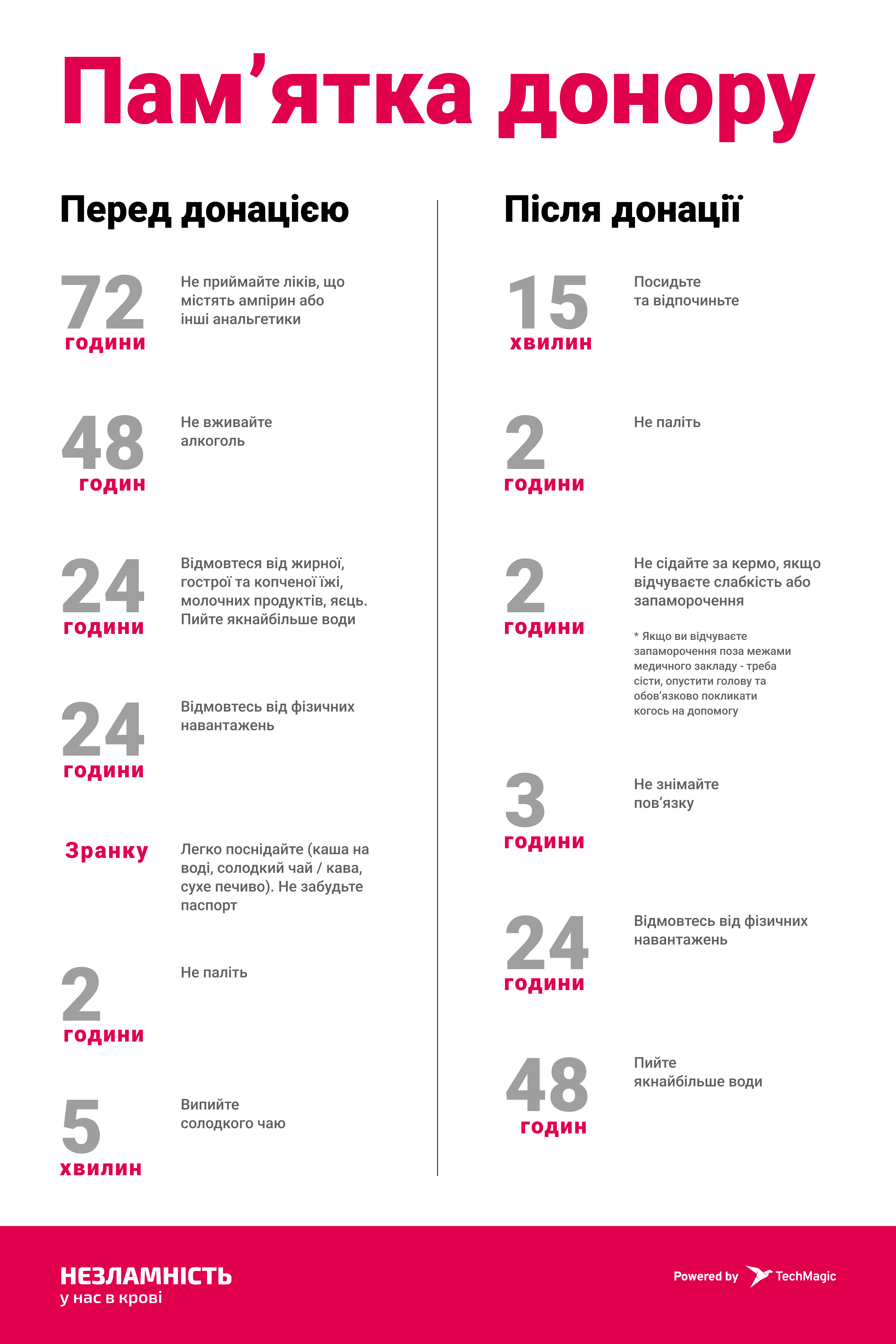У день здачі крові вас зустріне координатор та супроводжуватиме на кожному етапі донації: реєстрація, скринінг, безпосередня здача, підживлення та відпочинок після здачі крові та надання допомоги за потреби. Завантажте для себе памʼятку донора, щоб бути на 100% готовим до донації.
